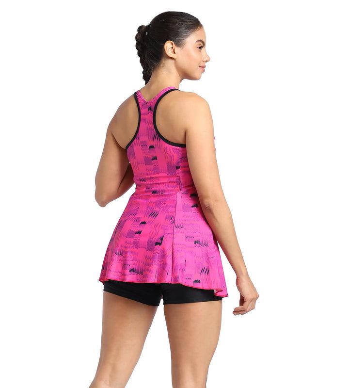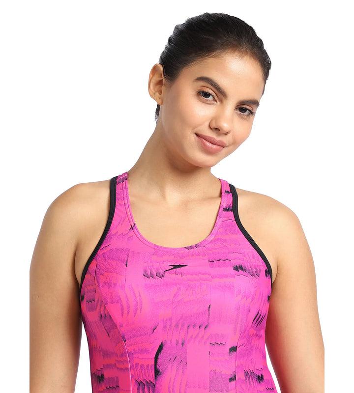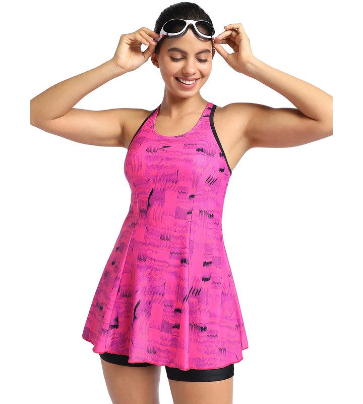 Speedo Women's Endurance Printed Racerback Swimdress With Boyleg -Black & Wineberry